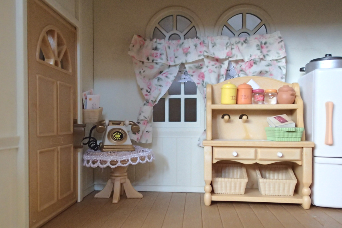 さて、この白い電話をどこのお宅に置こうかな〜と考えて、やっぱり白い電話なら白いお家だな!という訳で、シマネコさん一家の住む「お家はおしゃれな森のキッチン」に置くことにしました。